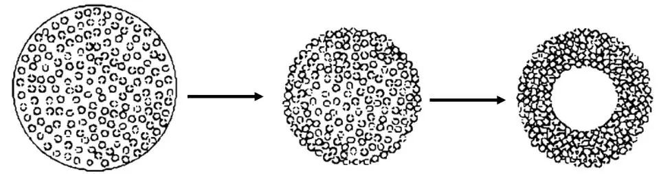噴霧干燥法是制備噴涂涂層用原料的重要方法,通過使用適當(dāng)?shù)挠袡C(jī)黏合劑聚集不同的小顆粒進(jìn)而從漿料中經(jīng)干燥獲取顆粒團(tuán)聚體。漿料在干燥過程中發(fā)生快速傳熱和傳質(zhì),根據(jù)操作參數(shù)、漿料特性的不同,得到諸如空心、致密、多孔等形態(tài)各異的球形或其他形狀的顆粒團(tuán)聚體[32,33]。噴霧造粒得到不同結(jié)構(gòu)的團(tuán)聚顆粒如圖2[32]所示。漿料在噴霧干燥過程霧化為球形液滴后的快速干燥階段,液滴中的水分快速蒸發(fā)產(chǎn)生毛細(xì)管力,進(jìn)而液滴內(nèi)部的細(xì)小顆粒在毛細(xì)管力的作用下向表面遷移并最終形成空心顆粒,如圖3[34]所示。因此,在噴霧干燥過程中,漿料的分散性是決定團(tuán)聚顆粒結(jié)構(gòu)的關(guān)鍵因素,高分散性漿料中細(xì)小顆粒的遷移阻力更小,更有助于獲取具有空心結(jié)構(gòu)的顆粒團(tuán)聚體。
