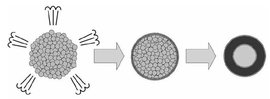 圖4 等離子體燒結(jié)形成空心結(jié)構(gòu)的原理示意圖[50]Fig.4 Principle schematic diagram of formation of hollow particles by plasma sintering process[50]