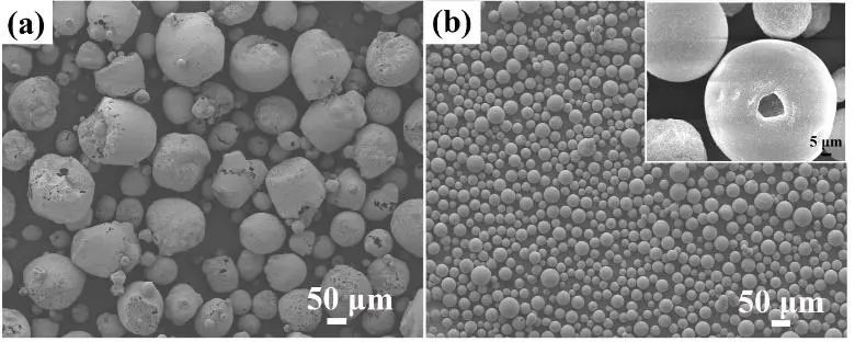 圖6 不同方法制備的YSZ空心顆粒:(a) 噴霧干燥法; (b) 噴霧干燥和等離子體燒結(jié)聯(lián)用Fig.6 YSZ hollow particles prepared by different methods: (a) spray drying process; (b) spray drying combined with thermal plasma sintering