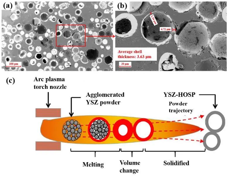 Qiu等[52]以中位徑46.43 μm且空心比例不足10%的YSZ粉末為原料,采用三陰極等離子體炬燒結(jié)制備得到了球化率接近100%、顆粒中位徑52.38 μm、空心顆粒比例93.4%且平均壁厚僅為3.63 μm的四方相YSZ粉末,合成的空心微球及顆粒的空心化過程如圖5所示。